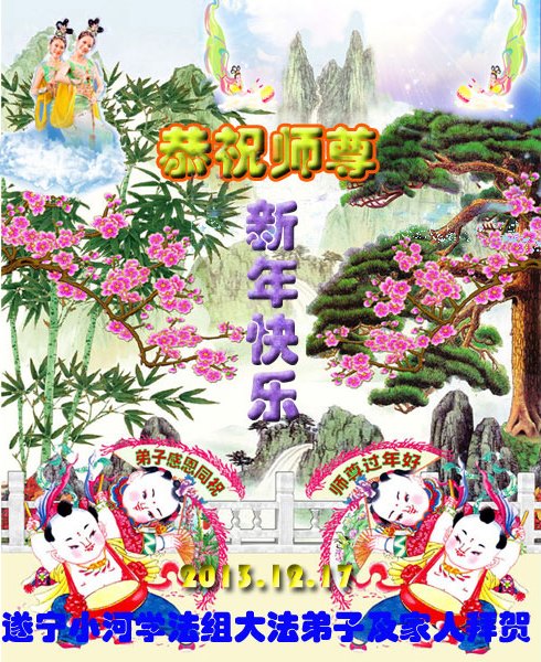 值此元旦、新年即将到来之际,我们遂宁小河学法组大法弟子及家人向慈悲伟大的师尊致以元旦、新年的问候!师父新年好!师父您辛苦了!感恩师父一年来的慈悲救度、慈悲加持、慈悲点化!千言万语汇成一句话:恭祝师尊新年快乐!在新的一年里,我们会更加精進,努力做好师尊教诲的三件事,多学法,学好法,遇事向内找,修好自己,多多救人,完成自己的大愿。让师尊多一份欣慰,少一份操劳。再次感恩慈悲伟大的师尊!拜贺师尊! 四川省遂宁一家八位大法弟子及家人恭祝师尊新年快乐!