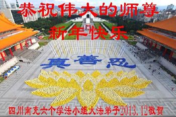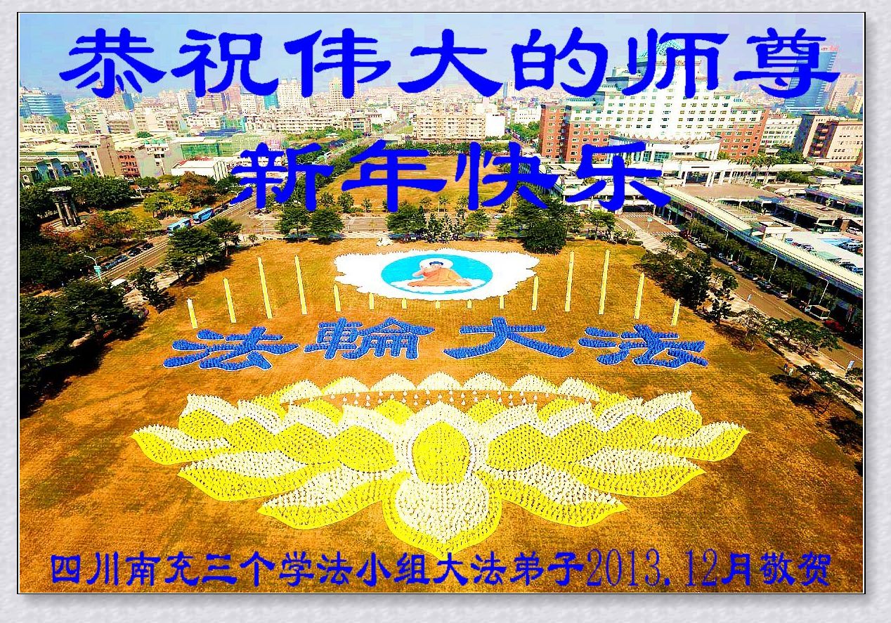 南充全体大法弟子想念尊敬的师父,盼望师父早日回到中国大陆。 四川南充全体大法弟子新年敬上 2013.12 四川南充六个学法小组大法弟子恭祝师尊新年快乐!