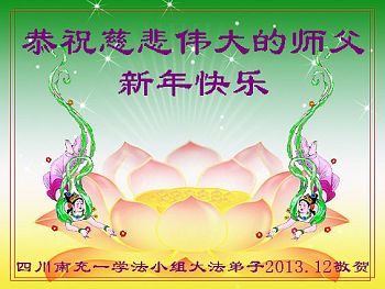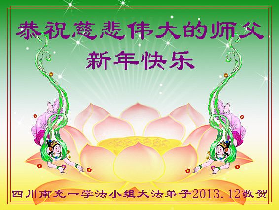 弟子们一定配合好整体,做好三件事,向内修多救人,让师父多一份欣慰,少一份操劳。 四川南充一学法小组新年敬上 2013.12 南充全体大法弟子恭祝师尊新年快乐!