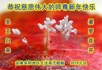安徽淮北煤矿全体大法弟子祝贺伟大慈悲的师尊二零一四年元旦快乐!全体弟子跪拜师尊的慈悲苦度。我们一定在正法最后的时间里救度更多的有缘人。 安徽众弟子恭祝师尊新年好! 师恩瀚 超越苦難濟滄海 悲憐蒼生乾坤挽 苦心救度巨難承 慈悲呵護法中蓮 延时只为众生来 諄諄告誡惜機緣 嚴冬盡逝春風盪 一院奇葩香满園 安徽弟子跪拜师尊:恭贺师尊新年好!感师苦心救度弟子们一定精進不止,完成使命直至圓满! 安徽淮南全体法轮大法弟子恭祝慈悲伟大的李洪志老师圣诞快乐!