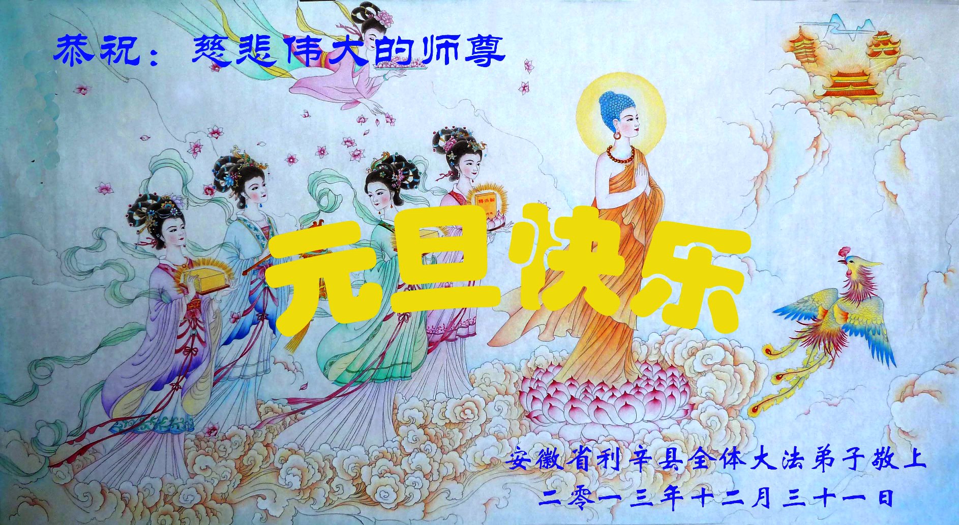 师父您好! 十几年来,在您的慈悲呵护下,弟子终于在磕磕绊绊中逐渐的走向清醒和成熟。在我们身边,能看到同修们的勇猛精進和慈悲救人,能听到得救世人的由衷感谢,能目睹新得法学员的身心变化,也见证了无知迫害大法者的凄惨报应!弟子更加体会到自己的巨大使命和责任!为了众生的美好未来,为了师尊少一份操劳、多一份安慰,弟子一定更加精進,静心学法、真心实修、正念除恶、慈悲救人,听师父的话,多学法、更多的唤醒和救度世人,不负史前大愿、不负师父慈悲苦度,坚定一思一念,走好分分秒秒的每一步。 新年元旦之际,遥祝师尊节日快乐!万事如意!!弟子叩拜!! 安徽省亳州市利辛县全体大法弟子恭祝师尊元旦快乐!