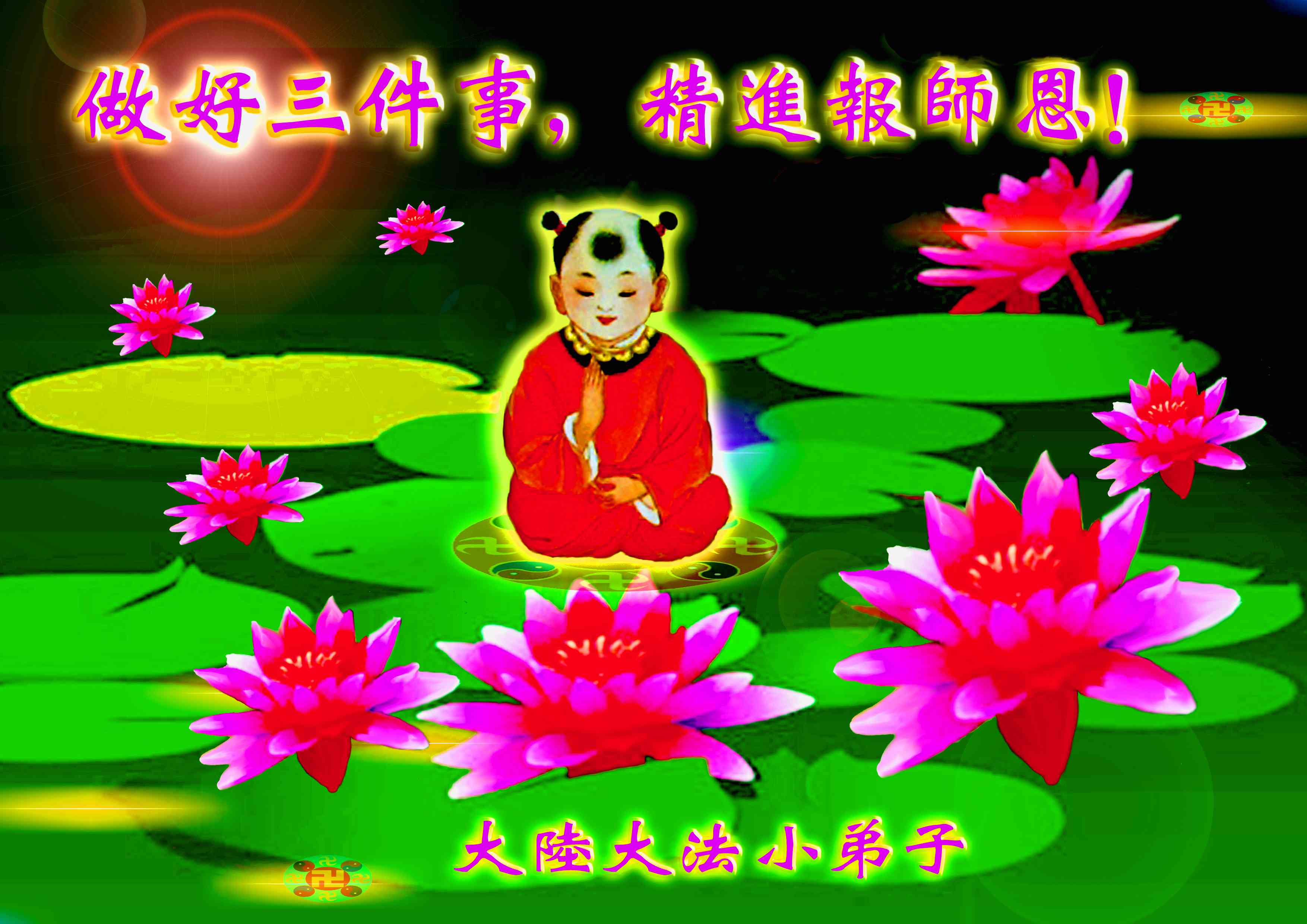 我们一定会做好三件事,修好自己,请师父放心!盼望早日见到师父。 山东省烟台市莱阳市一位十一岁的大法小弟子恭祝慈悲伟大的师尊新年快乐!