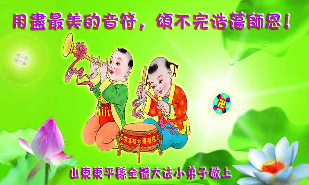 师父您好!我们非常想念师父! 虽然我们看不到师父,但我们感到师父就在弟子身边,时刻看护着弟子,每当弟子做不好时,师父就慈悲的点悟弟子,使弟子能够时刻看到自己的不足,随时用真善忍宇宙大法的法理归正自己,使弟子在返本归真的大道上不断的向前迈進,弟子每一步的提高都离不开师父的苦心操劳。 师尊的洪恩浩荡弟子无以为报,唯有更加精進的做好三件事,多救度众生,早日跟随师父回到自己美丽的家园。 跪拜师尊!合十! 山东省泰安市东平县全体大法小弟子恭祝师尊元旦快乐!