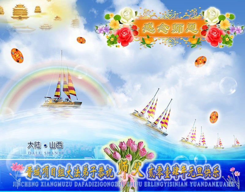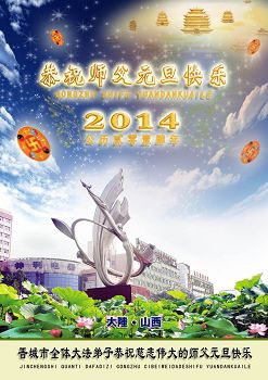 慈悲伟大的师父:您好!您辛苦了!师父请您放心,我们会继续按照师父的要求做好三件事,坚定不移,稳步走好正法之路,修好自我,圆容整体,救度众生,兑现誓约。 大陆山西晋城市项目组大法弟子恭祝师父2014年元旦快乐!