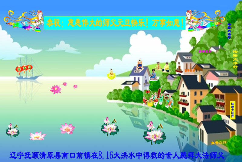 谢谢师父的慈悲苦度!谢谢师父安排我们今生成为大法弟子的亲人!他们的真诚、善良和坚忍已经在无为中悄悄归正了我们,使我们见证了这个人神同在的伟大历史时期!盼望在大法的春天里,我们也能幸运的成为大法弟子。 辽宁抚顺清原县南口前镇在8.16大洪水中得救的世人恭祝慈悲伟大的师父元旦快乐!