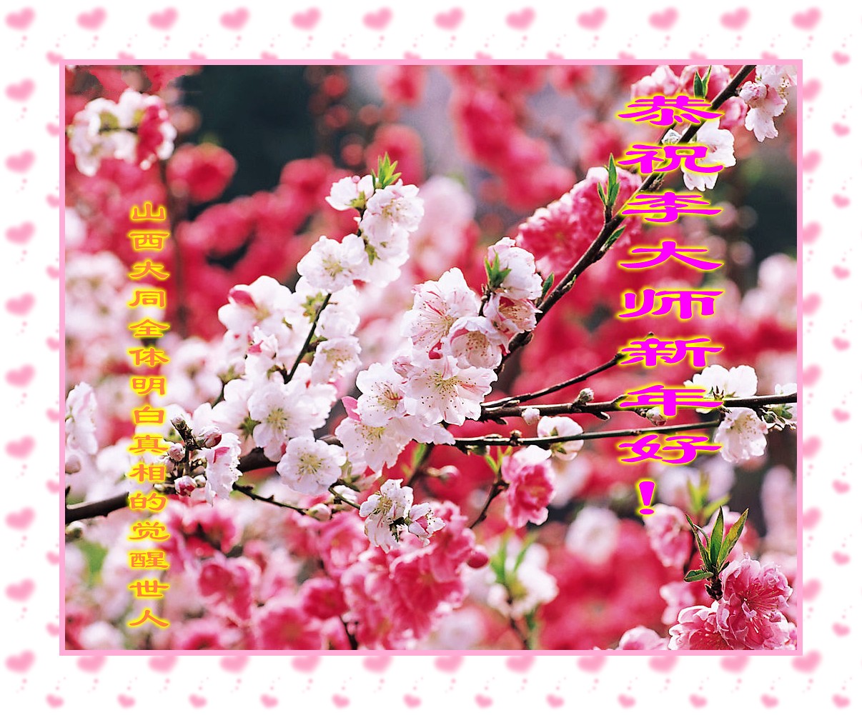 尊敬的恩师您好!得救后的一个生命(化名静新)祝您新年快乐!法轮大法的洪传是宇宙中所有生命值得庆幸的大好事。不仅救度了大法学员,也救了无量众生。法轮大法虽然在中国遭受了共产邪*党-的百般打压与迫害,我相信这不仅考验了大法弟子,也让我们常人看清了中共邪*党-的丑恶表演。是与非、善与恶,尽显无遗。从而更加认清了它邪的本质,才退出了它,远离它。退!党!后我一切顺利,在此我代表全家人感谢恩师。衷心祝愿恩师及全家人新年快乐! 山西大同全体明真相觉醒世人恭祝慈悲伟大的李大师新年快乐!