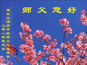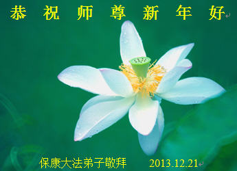 尊敬的恩师:您好! 新年之际,弟子们向师父致以亲切的祝福!祝师父节日愉快! 弟子们紧跟师尊修炼,牢记师父教导:以宇宙大法“真、善、忍”的法理要求自己,归正自己,用慈悲、宽容救度众生,常常自省不足,在大法中升华着,坚定的走在正法路上。 谢谢师父!佛恩浩荡! 孝感市一学法小组 全体学员向师父叩拜! 2013-12-15