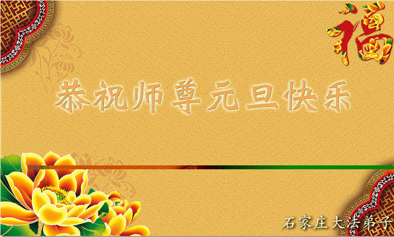 万幸得法于十七年前,从那时起我很自豪有了师父。助师正法十余载,带着对师父无限的感恩和敬意,我发自内心的称师父为师尊。二零一四年元旦来临之际,恭祝师尊新年好!面对本地的形势,反思自己走过的路,在学法、发正念和讲真相三件事上还要弥补不足,继续做好。 河北省石家庄华夏家园大法弟子恭祝师尊新年好!