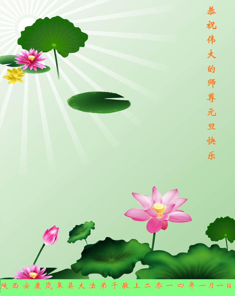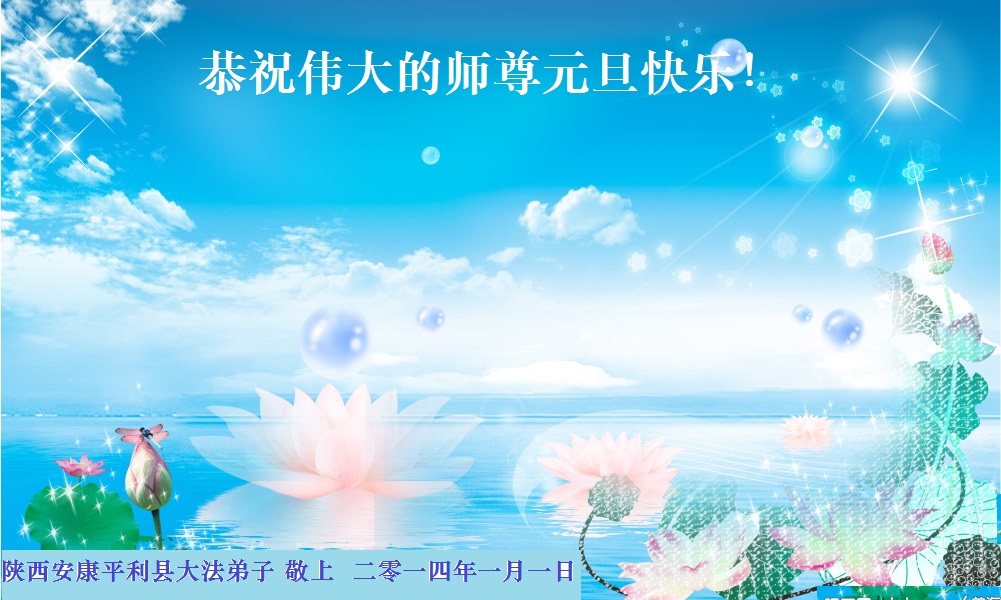 正法时期已近尾声,跟师尊回家的辉煌时刻即将到来,弟子抑制不住的泪流满面,十几年的正法修炼路上,如果不是师尊分分秒秒的慈悲呵护,哪有弟子的今天,如果不是师尊一步一步引领弟子在大法中时时刻刻的升华,哪有今天崭新的自己,一个荡尽了为私为我、而无私的为着别人的人是那样的玄妙自在,为别人着想是那样的幸福,是慈悲伟大的师尊,是真善忍宇宙大法把弟子成就为无私的大法徒!弟子感恩师尊!跪拜师尊!合十! 陕西安康汉滨区全体大法弟子恭祝伟大的师尊元旦快乐!