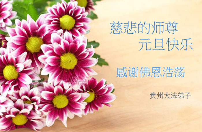 过去的一年,贵州大法弟子紧跟师父正法進程,在做好三件事中,每个真修弟子都在救人忙。谨记师父教誨,修好自己,努力完成好自己的历史重任,跟师父回家。在新的一年里,弟子们正念正行更上一层楼。让师父多一分欣慰,少一分操劳!在这元旦即将到来之际,贵州大法弟子敬向师父恭问一声辛苦了! 贵州省贵阳一大法弟子恭贺师尊新年好!