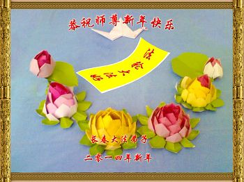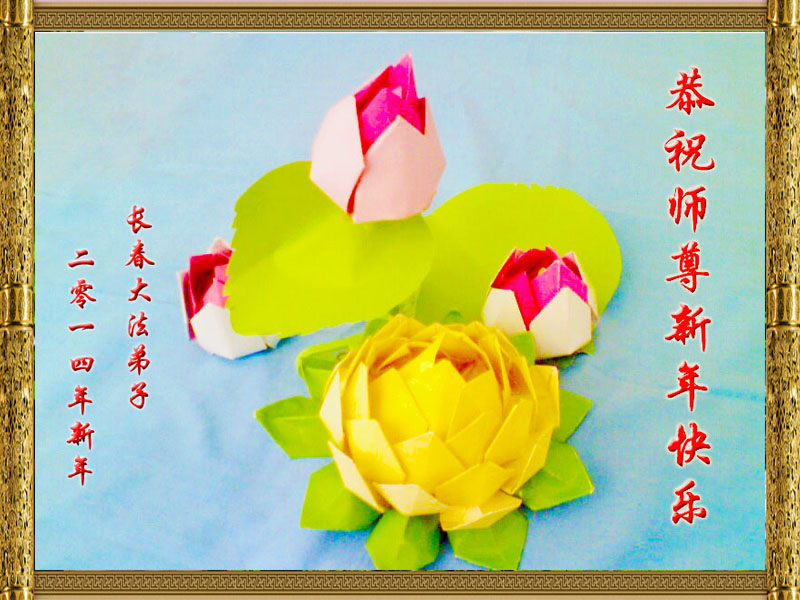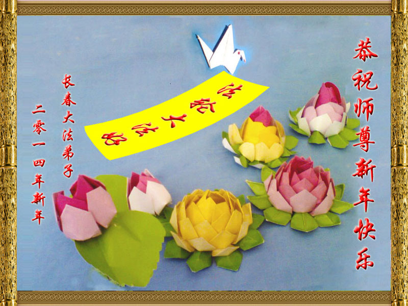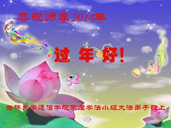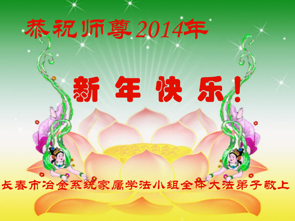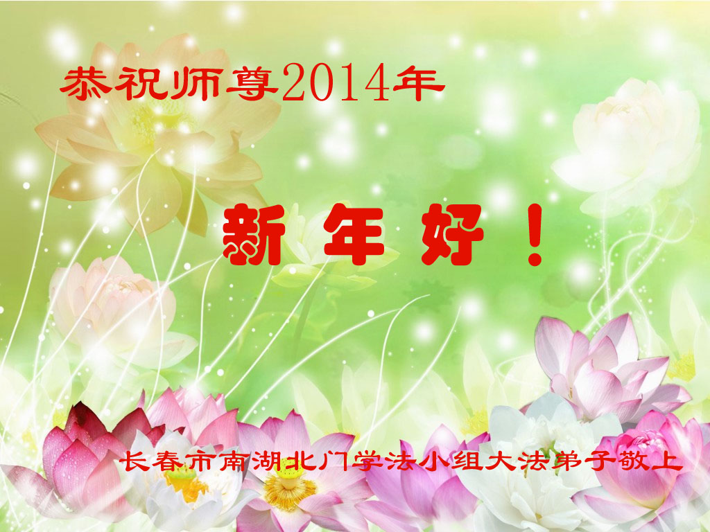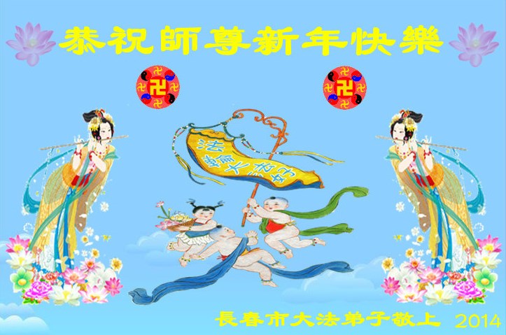 在二零一四年即将来临之际,长春家乡的大法弟子想念恩师!回顾过去、展望未来,我们决心在新的一年里一定要更加精進,做好三件事,静心学好法、多学法,遇事实修向内找,圆容整体,多发正念,助师多救人,走好每一步,决不辜负师父的慈悲苦度,完成史前大愿,迎接辉煌壮观的新世纪的到来!在此跪拜祝愿师父新年快乐!永远快乐! 吉林省长春母女俩大法弟子恭祝师尊新年快乐!