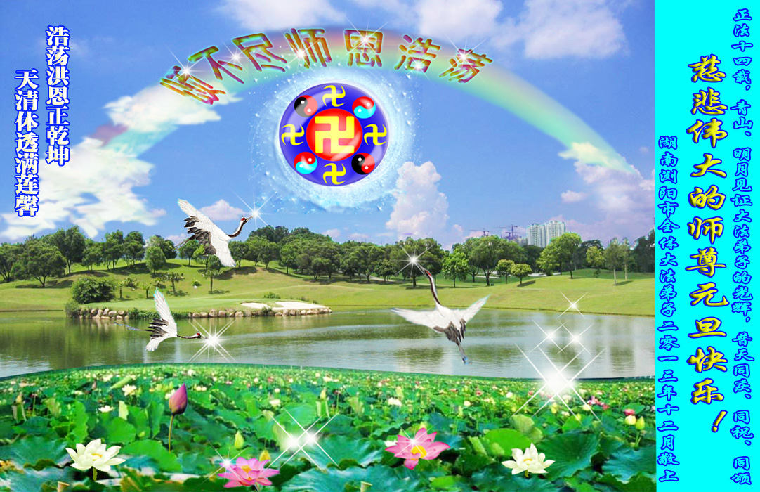 大法洪传廿一载 转动法轮换新颜 原始生命被救度 十方众生有明天 师尊正法万魔拦 干扰救人罪滔天 邪恶招数全使尽 反助大法世界传 谁知师尊苦与忧 无量罪业担自身 除恶灭邪挽狂澜 佛恩浩荡大无边 弟子叩首泪满面 盼与师尊早见面普天同祝师尊元旦快乐! 湖南省浏阳市一学法小组 二零一三年十二月二十二日敬上,合十! 湖南省长沙市浏阳市全体大法弟子祝师尊元旦快乐!