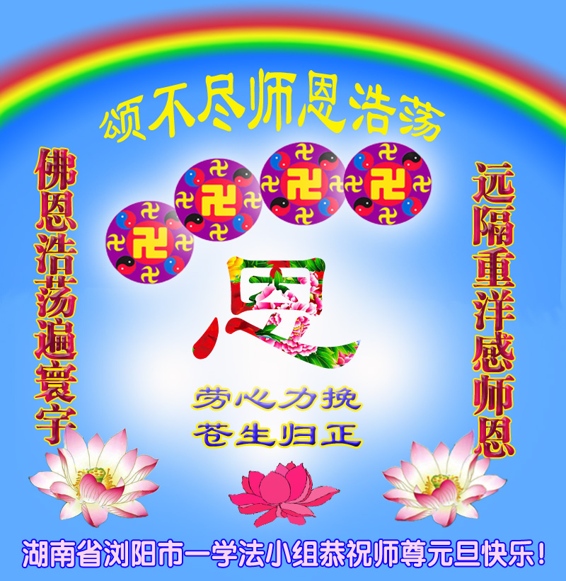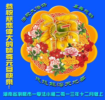 【明慧网二零一三年十二月三十一日】 湖南省长沙市浏阳市一学法小组大法弟子恭祝师尊元旦快乐!