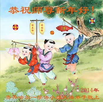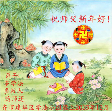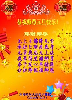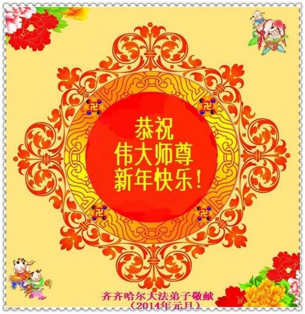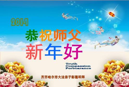时间如飞,不觉2014年新年即到,在新的一年里,我们更加努力静心学法,多学法、学好法、修好自己,做好三件事,完成来时的史前大愿。十几年的风雨洗礼,道路蹉跎,在师尊慈悲的呵护下,我们会更加勇猛精進,不负恩师的慈悲苦度。 黑龙江省齐齐哈尔全体大法弟子恭祝伟大的师尊新年快乐!