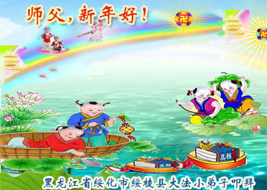 在新的一年到来之际,弟子跪拜师父新年好,在证实法的十几年中,弟子做的不够好,让师尊操心了,弟子一定好好学法,做好三件事,不负师父的苦心救度。做一个合格的大法弟子。在此代表全家大法弟子(两个小弟子及妻子同修)向师尊跪拜问好!师父新年好!师父新年好! 濮阳大法弟子全家跪拜! 黑龙江省牡丹江市海林市大法小弟子恭祝师尊元旦快乐!