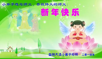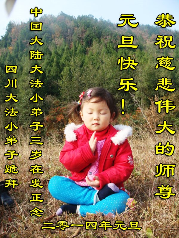 尊敬的师父:您好! 值此2014年元旦来临之际,我们一家修炼人祝师父新年快乐! 我们家的小弟子经常问,师父什么时候回来?我们什么时候能看到神韵的现场演出?我回答说:只要我们做好三件事,不久的将来,我们就会见到师父,就会看到神韵在大陆演出! 在此将最美好的祝愿送给师父,愿师父早日归国,与国内大法弟子相聚! 江苏昆山大法弟子敬上 河南濮阳大法弟子全家跪拜师尊新年好!