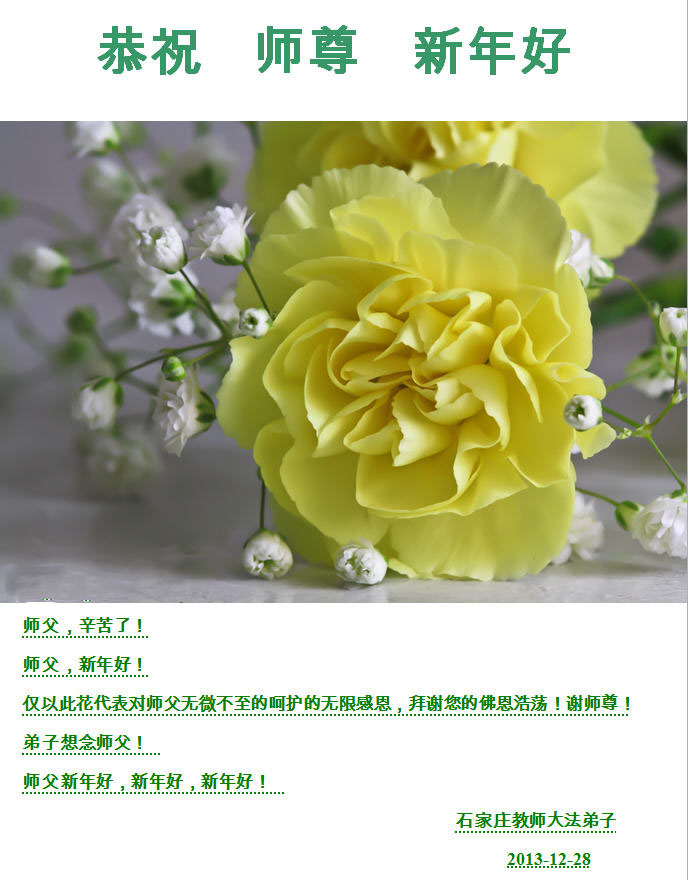 在新年来临之际,枣庄市大法弟子向师尊献上美好的祝福!师尊新年好!您辛苦了!弟子想念您!我们一定按您的要求做好一切,请师尊放心。 山东省枣庄市大法弟子 二零一三年十二月二十四日 山东省烟台市招远市一学法小组全体大法弟子恭祝慈悲伟大的师尊元旦快乐!