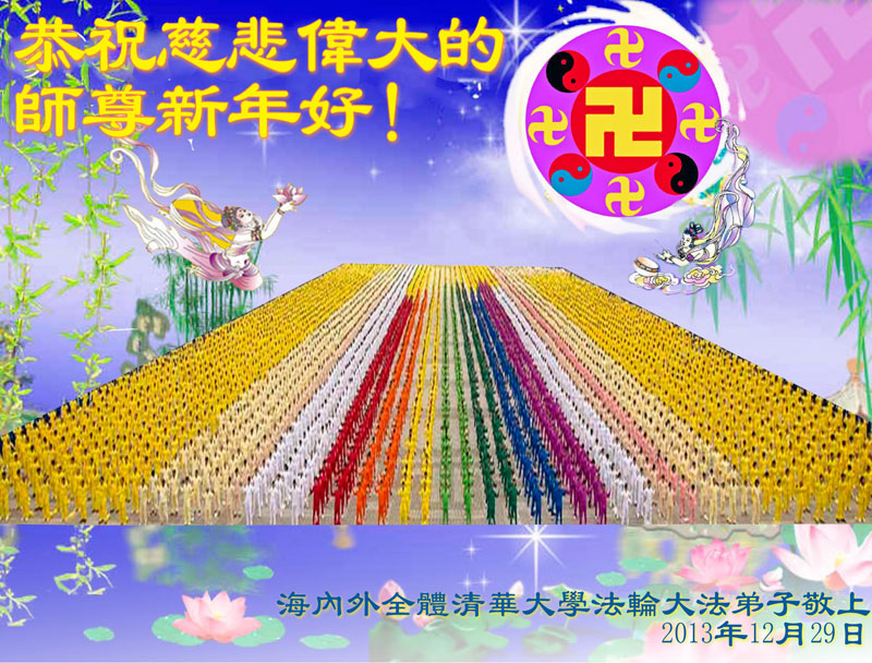 尊敬的师父:新年好! 用尽人世间的语词,都无法表达弟子此时此刻的心情,一句问好又怎么能传递弟子对师父慈悲救度的感恩之情呢!弟子的生命,弟子的一切的一切,都是师父给的,都因为幸遇师父、幸得大法才使我的存在有了伟大的、无穷无尽的意义与光彩,弟子一定坚修大法志不移,尽最大的努力做好三件事,助师正法多救人,圆满跟随师父返回家园。唯有以此答谢师父的救度大恩!弟子满含热泪再次叩拜师父,祝师父元旦佳节好! 西安一高校大法弟子全家敬上 二零一三年十二月二十四日 海内外全体清华大学大法弟子恭祝慈悲伟大的师尊新年好!