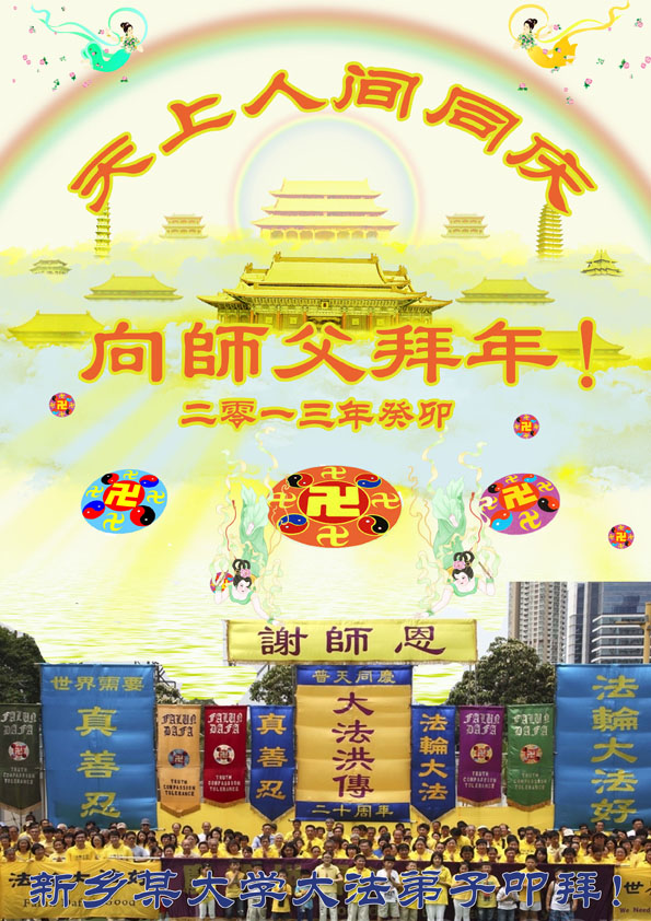 中国科技大学大法弟子敬拜 在二零一三年新年来临之际,河南省新乡某大学大法弟子向伟大慈悲的师父拜年!祝师父过年好!