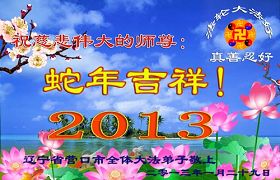 在新的一年里,我们一定要精進实修,做好三件事,不辜负师尊的慈悲苦度。 深沟寺地区大法弟子 二零一三年一月二十六日 辽宁一家庭资料点大法弟子恭祝慈悲伟大的师父过年好!