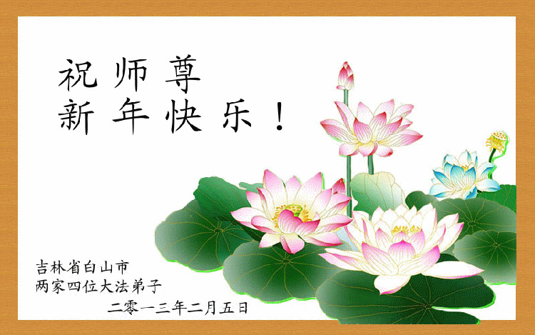 请师父放心,弟子们一定做好三件事,走好最后证实法救人之路。 长春一学法小组 2013年2月5日 吉林省长春大法弟子敬祝恩师癸巳年过年好!