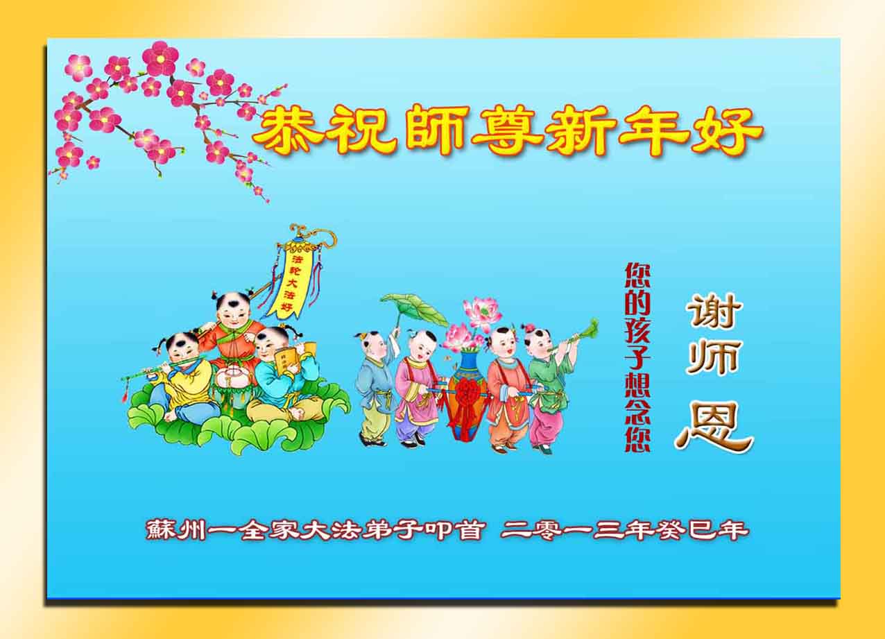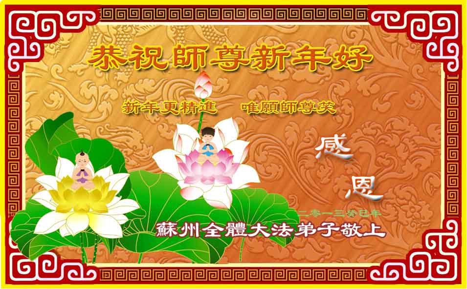 弟子们远隔重洋恭祝慈悲伟大的师尊:过年好!师尊您辛苦了!感谢师尊的慈悲苦度,弟子们在新的一年里一定要勇猛精進,盼师尊早日回大陆。 江苏省苏州一全家大法弟子恭祝师父新年好!
