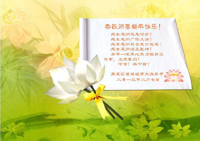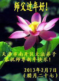 用尽人类最美好的语言也无法表达我们对师尊的敬意,敬献世上最珍贵的礼物也无法表达我们对师尊的感恩,只能用努力做好三件事、修好自己、完成我们的责任和使命来报答师尊的浩荡佛恩。 黑龙江省依兰县达连河镇全体大法弟子叩拜。 二零一三年二月七日 天津市南开区大法弟子恭祝师尊新年快乐!