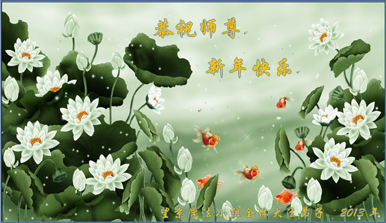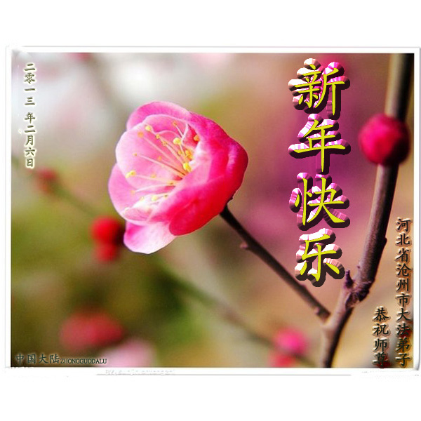 恩师是您为众生付出了巨大的承受,才又迎来了这苍宇再造的又一年。是您为弟子抚平内心的千疮百孔,洗刷着生命历史长河中留下的污迹,又塑造了未来的金碧辉煌,丰满着宇宙世界的一切。感恩师尊无量慈悲与佛恩浩荡,人间语言已无法表达,唯有精進实修,多救众生,少让师父操心。再次恭祝师尊:新年好!新年快乐! 沧州大法弟子跪拜 2013.02.06 重庆合川大法弟子祝师尊新年快乐!