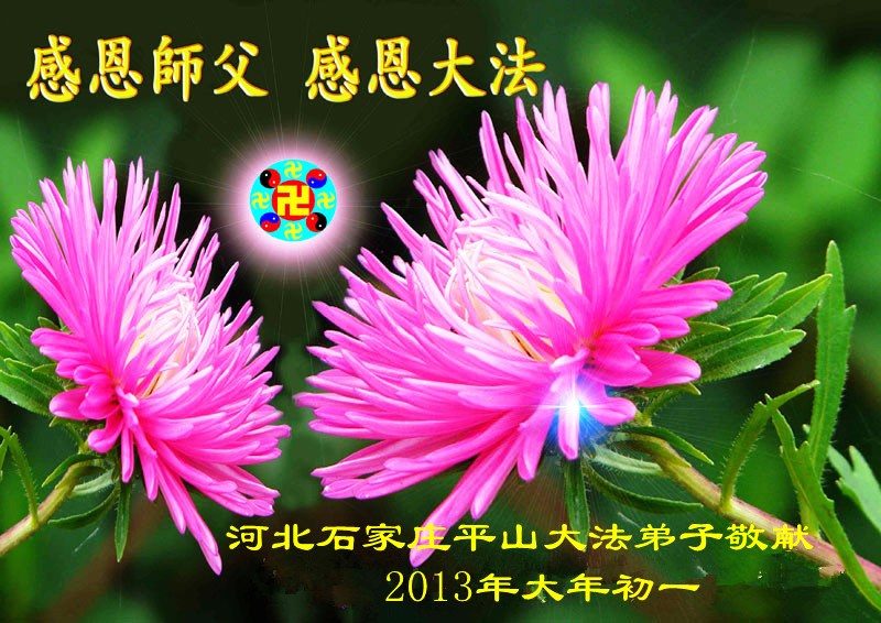慈悲伟大的师尊: 新年好!我们是山东威海大法弟子,在这辞旧迎新的时刻我们全体威海经区大法弟子及大法弟子家人向师尊叩拜:恭祝师尊新年好!在过去的二零一二年里我们努力的做好三件事,在即将到来的二零一三年里我们要更加精進,不辜负师尊的慈悲苦度,做好我们该做的!圆满随师还! 再次恭祝师尊新年好! 山东威海大法弟子 敬上 二零一三年二月九日 江苏常州大法弟子恭祝师尊新年好!