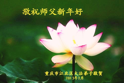 我们全家给师尊拜大年。我们全家很多都是修炼的人,在新的一年里,努力做好三件事,不负师尊慈悲救度,随师父回家。 营口大法弟子 2013年2月8日 重庆市江北区大法弟子敬祝师父新年好!