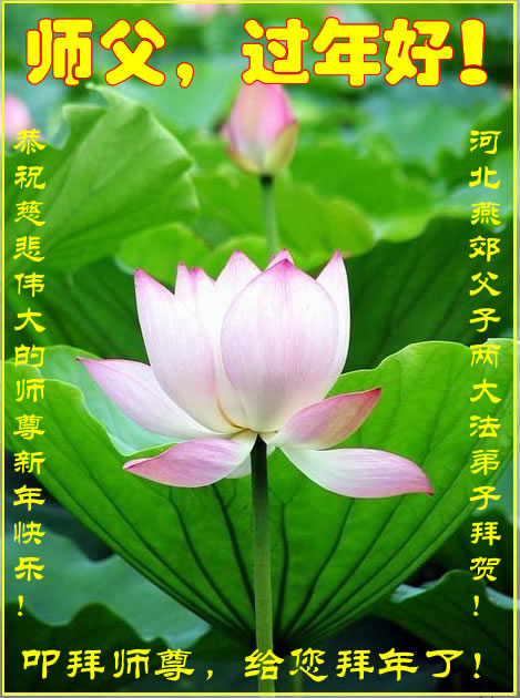 恭祝师父过年好!师父您辛苦了!弟子在新的一年里会做的更好,修去一切执著与人心,完全同化大法,圆满完成救度众生的伟大使命!请师父放心! 沈阳市法库县一家夫妻大法弟子 二零一三年二月七日 河北燕郊父子两大法弟子恭祝慈悲伟大的师尊新年快乐!