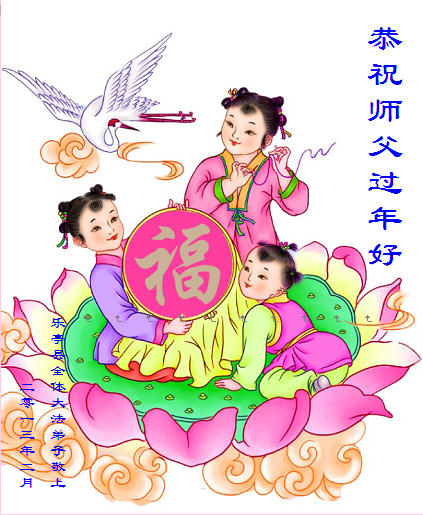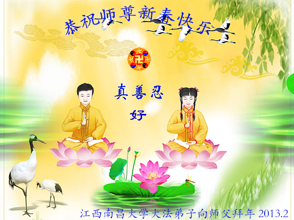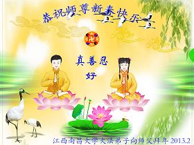 恭祝慈悲伟大的师尊新年快乐!师父呀,弟子修的很不精進,让您费心了。以后一定努力做好,不辜负师尊的慈悲苦度! 叩拜师尊,给您拜年了! 河北燕郊父子两大法弟子拜贺! 2013年2月7日 江西南昌大学大法弟子向师父拜年!