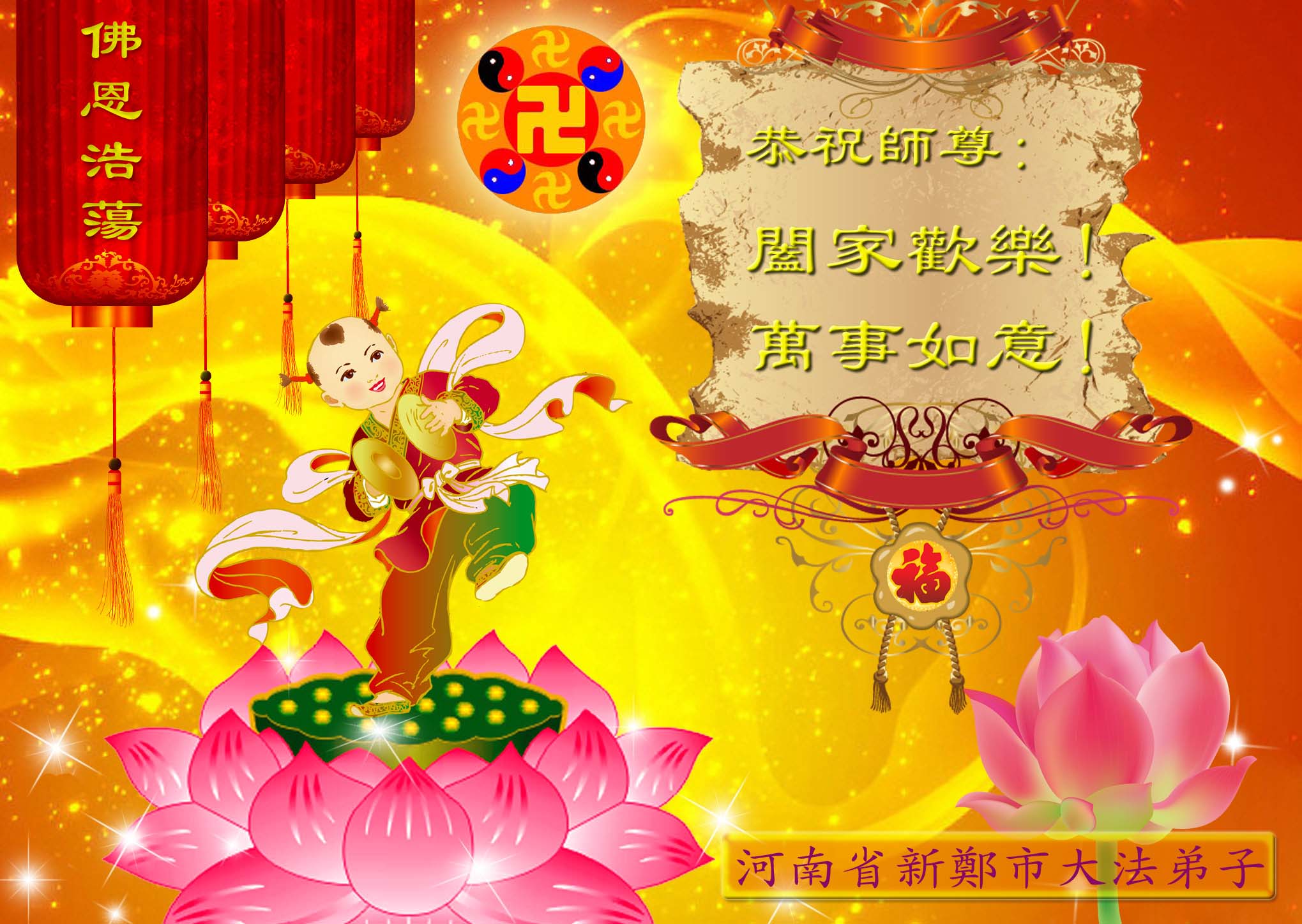 恭祝慈悲伟大的师尊: 新年快乐!阖家欢乐!万事如意! 新郑市大法弟子不忘师恩,勇猛精進,兑现誓约!河南省新郑市大法弟子 中国河南省新乡大法弟子全家和两个学法小组恭祝师尊新年好