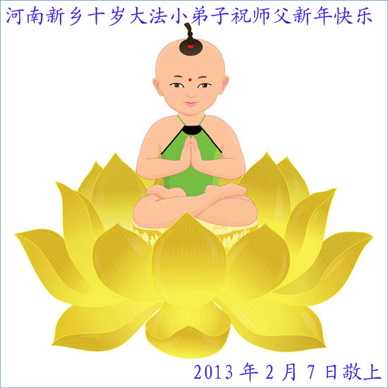 祝师尊新年快乐,弟子一定要做好三件事,兑现自己的誓约,不辜负师尊的期望。天津市河东区学法小组弟子 二零一三年二月七日 内蒙古自治区呼伦贝尔市牙克石市全体大法弟子恭祝师尊新年快乐!