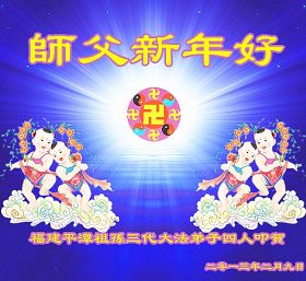福建平潭一家祖孙三代四人先后得法,共沐佛光,无比感恩师父的慈悲救度!敬祝师父癸巳年快乐、如意、吉祥!福建平潭一家祖孙三代大法弟子四人叩贺 年2月9日