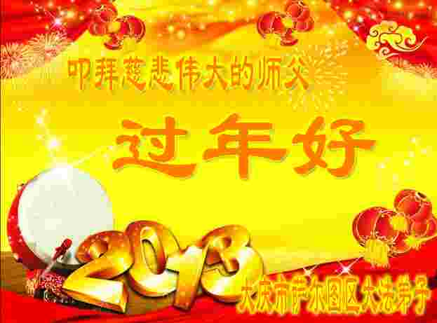师尊您好!2013年的到来,更让弟子感觉时间的紧迫,救人更急,这也是对弟子们的最后的考验。我们会做的更好,救人更多。少让师尊为我们操劳,我们会让师尊有更多欣慰的笑。过好每一关、走好每一步,扎扎实实的做好三件事,让更多的世人知道法轮大法好!明真相能得救,世人都在觉醒。感恩师尊为我们铺路,弟子们把有缘人救。眼望苍天心苦盼,盼望师尊回。 大陆的一名姓靳的常人真心的发自内心的向李大师问好!问候李大师新年好!