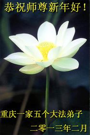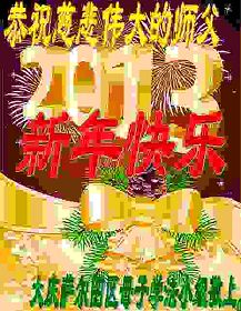 在这新春佳节之际,我不会编贺卡送给师父,我深深感谢师父把我从苦海里捞上来,让我懂得了怎样做人,让我知道了生命的意义。感谢师父为众生承受苦难,感谢师父挽救宇宙大穹,师父真是太辛苦了!我一定好好学法,我要返本归真,我要坚定正信,我尽力做好三件事,力争跟师父回家! 中国大陆黑龙江省鸡西市大法弟子三代人向师尊叩拜新年好!