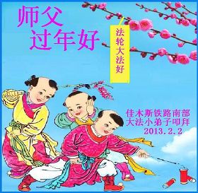 恭祝慈悲伟大的师尊:過年好! 佳木斯铁路南部全体大法弟子向慈悲伟大的师尊合十叩拜:师尊您辛苦了!我们全体大法弟子想念,盼望师尊早日归国,师徒团聚。恩师慈悲苦度,我们无法报答,只有按照师尊的要求,集体学好法,遇事向内找,互相配合好,做好三件事,助师正法救度更多的众生,共同精進,整体升华,完成史前大愿,圆满随师还。 佳木斯铁路南部全体大法弟子叩拜 二零一三年二月二日 河北盐山县大法弟子恭祝师尊新年好!