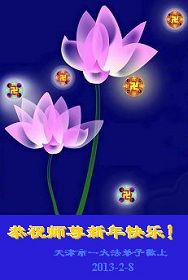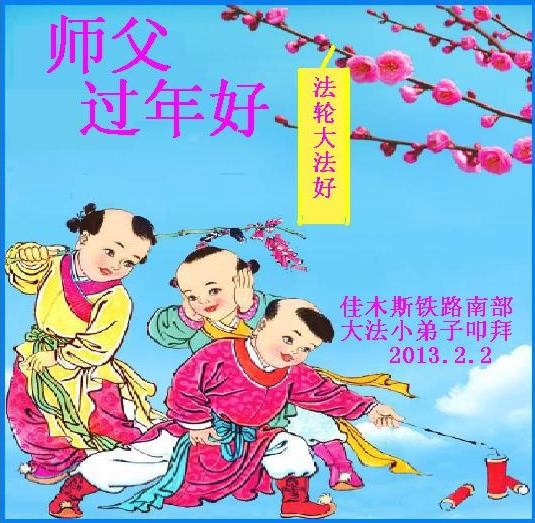 河北弟子叩拜师尊!恭祝师尊新年快乐!在新的一年里弟子更加精進,坚定实修,做好三件事,圆满随师还。二零一三年二月八日 大陆一大法弟子家属恭祝李老师新年好!