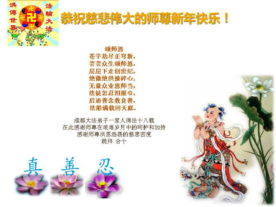 转眼又一春 天地两重身 菏泽逢甘露 九死一生存 流遍江河泪 无以报师恩 奋蹄何忧晚 精進回家门 无我再造路 法定生乾坤绥化市祖孙三口大法弟子祝贺师父新年快乐 二零一三年一月一日 遂宁市四代同堂一家大法弟子恭祝慈悲伟大的师父新年快乐!