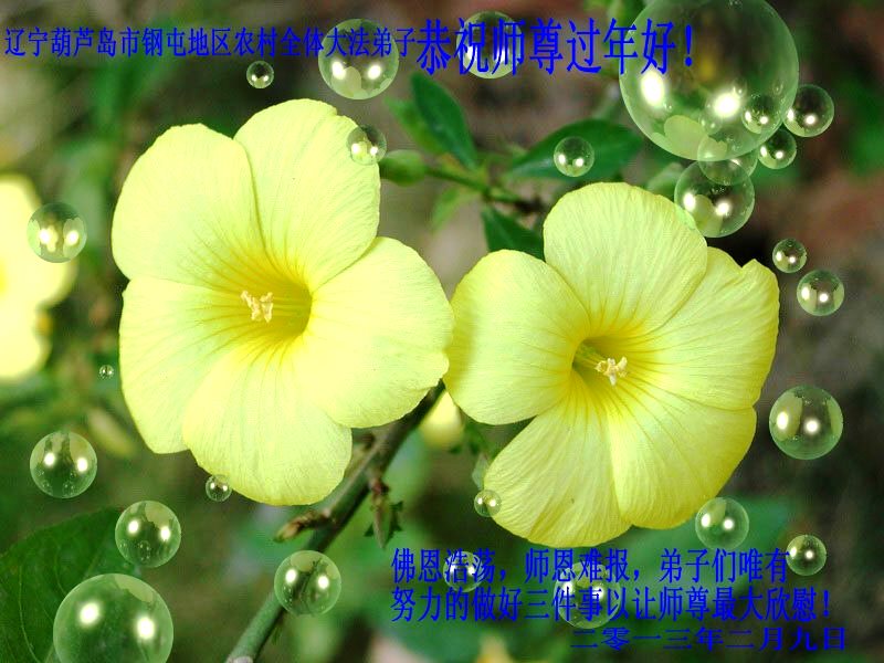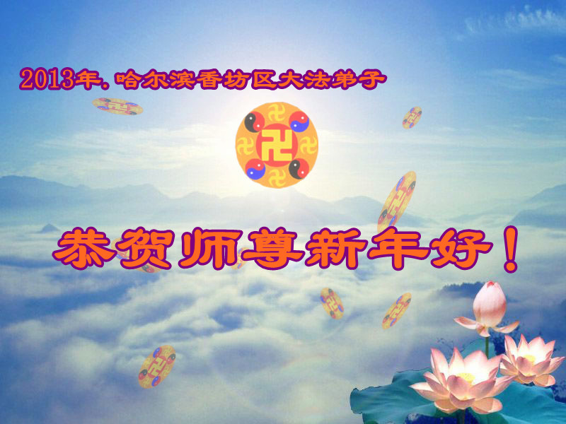 辽宁葫芦岛市钢屯地区农村全体大法弟子恭祝师尊过年好! 佛恩浩荡,师恩难报,弟子们唯有努力的做好三件事以让师尊最大欣慰! 二零一三年二月九日 黑龙江哈尔滨香坊区大法弟子恭祝师尊新年好!