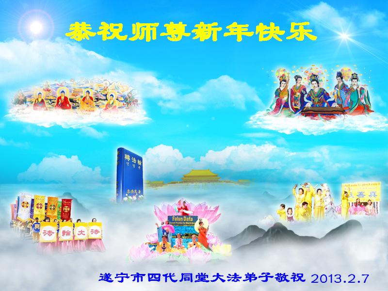 遂宁市四代同堂大法弟子给师父拜年 在新年来临之际,我们怀着无比喜悦的心情向师父道声新年好!在师父的庇护下,我们一家四代同堂又平安顺利的度过了多灾多难的2012年,在新的二零一三年中,我们将会放下一切执著心,更加精進,来答谢师父为我们所付出的一切,努力救度更多的众生,让鲜花开满神州大地的每个角落,愿师父早日回到家乡,带领我们一起返回家园。 大陆大法弟子清心恭祝师尊新年快乐!
