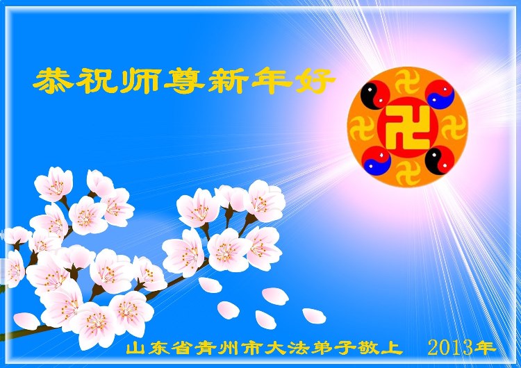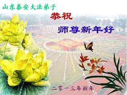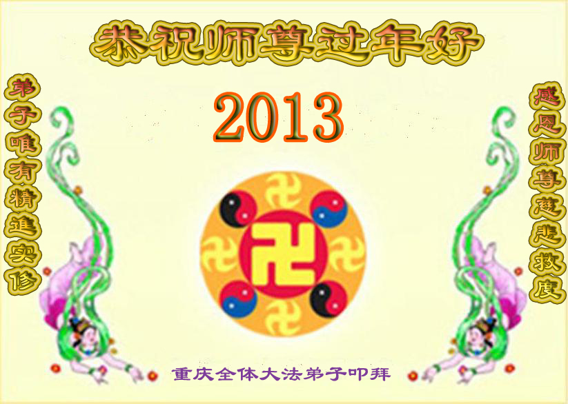 恭祝师尊过年好! 您辛苦了! 弟子们向慈悲伟大的师尊致以新年的问候!在新的一年里,弟子唯有精進实修,感恩师尊慈悲救度!加倍努力做好三件事。遇事向内找,修好自己,多多救人,完成使命,圆满随师还! 重庆全体大法弟子叩拜 二零一三年 山东泰安大法弟子恭祝师尊新年快乐!