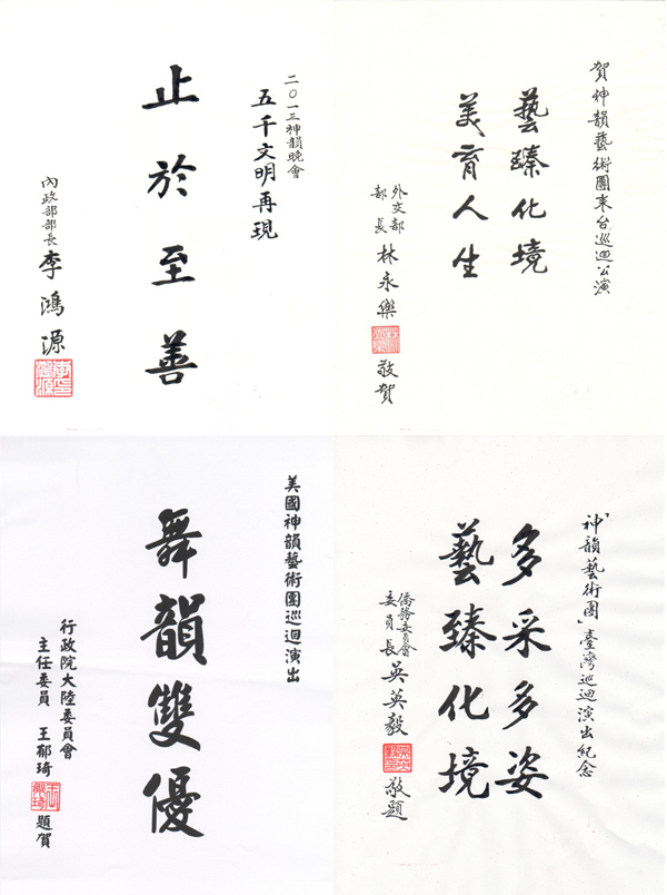 演出前,大厅的门外聚集了许多准备进场的与想要购票进场的观众,他们脸上洋溢着愉悦的笑容,期待这久违的艺术经典。总统马英九等中央政府官员特别致赠花篮到剧院现场,祝贺神韵演出成功。  台湾总统马英九给神韵晚会送花祝贺。 |