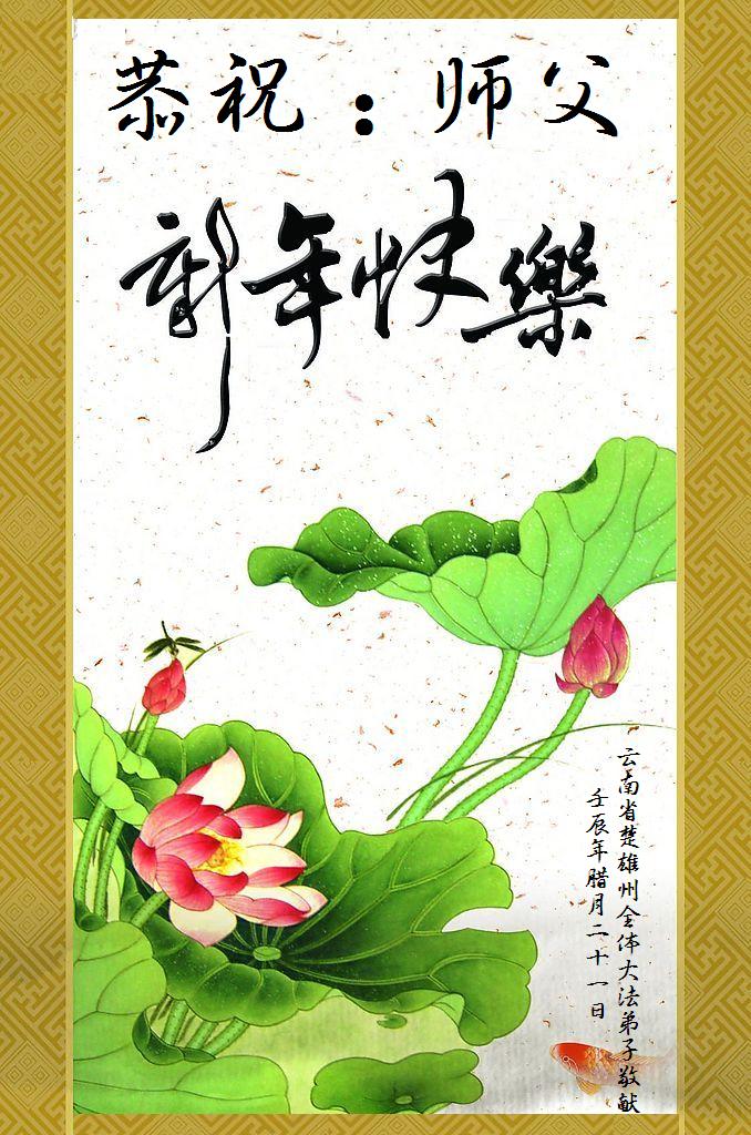 师父您辛苦了!我们盼您回来!弟子们恭祝师父新年快乐! 云南开远一学法小组 云南省楚雄州全体大法弟子向师父拜年,恭祝师父新年快乐!
