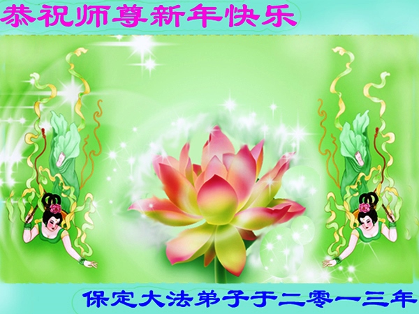 师父: 弟子已五体投地于您的脚下, 弟子的生命已在师父的救度中升华, 今昔对比倍感恩师无量慈悲伟大, 谢师恩,泪湿巾,我们无以报答。 过去我曾经无比羡慕释迦亲传弟子, 羡慕他们能与师父同在一世, 如今我们也成了法轮大法的第一批信众, 伟大的师父同样赐给了我们旷世无比的殊荣。 这里不存在丝毫的虚言自夸, 在中国从1992到2013坎坷神路有据可查, 从疾病缠身到身心健康, 从道德低下到品质高尚, 从斤斤计较到宽容海量, 从矛盾重重到文明礼让, 从损人利己到为他人着想, 从炼功洪法到中南海上访, 从天安门请愿到用各种方法讲清真相, 二十一年的足迹无不绽放着真、善、忍的光芒。 每一思每一念的纠正都贯穿着师父的点拨, 每一关每一难的逾越都蕴含着师父的呵护, 每个痛每个苦的经历都渗透着师父的承受, 每个台阶每一步升华都铭刻着师父的慈悲苦度。 十四个年头被迫害铸就了大法弟子的真体金刚, 令邪恶胆寒的正信注定了一切旧、恶势力的灭亡, 众生在无私的大法真相中觉醒, 救人,快救人,多救人是师父的急切愿望。 全球弟子助师正法责无旁贷, 揭露邪恶戳穿谎言真相大白, 邪恶魁首难逃法网审判在即, 神威大显清除浊邪人心大快。 乌云消,佛光照,宇净天清; 春花开,善信众,普天同庆。 洗污垢,穿新装,脱胎换骨; 盼师尊,踏国土,弟子跪迎。 河北省保定市定州市大法弟子恭祝师尊新年快乐!