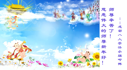 慈悲伟大的师尊新年好!“又到了合家团圆的新禧年,我们亿万弟子想念您……千歌万曲唱不尽师恩浩荡……”大法弟子向师尊拜年的歌声响彻云霄,宇宙中的众生沐浴在师尊洪大的佛恩浩荡中。我们大法弟子更要珍惜师尊为我们延续来的宝贵时间,更加精進实修,重视集体学法不走形式,遇事向内找,抓紧时间多救人,不辜负师尊的慈悲苦度! 成都八人学法小组叩拜谢师尊 四川省成都老少三名大法弟子恭祝师尊新年好!