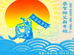 谢谢师尊的慈悲苦度,师尊辛苦了!恭迎师尊!唯愿师尊笑! 师尊正法洪图展 明慧网诞辰十三年 新!唐!人:节目扣心弦 大.纪.元;报纸飞满天 三大媒体共助师尊 交相辉映春满寰宇间 大法弟子修好在先 制止迫害发好正念 讲清真相救度众生 三件事要用心成就 证实大法了洪誓大愿 集体学法珍惜机缘 朵朵小花开满庭院 各个项目共同创建 三:退.高潮频频再掀 助师正法功德大圆满 叩谢师尊赐予弟子万古机缘,只有勇猛精進,才不愧师尊“正法时期大法弟子” 的伟大称号。 中国大陆成都全体大法弟子敬上 二零一三年元月二十七日 四川省成都学法小组恭贺师父新年好!