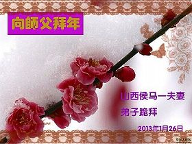 我们夫妻是2009年走進大法的,感谢师尊的慈悲救度,给了我们第二次生命。不管在什么情况下,我们不会忘记师父让我们做的三件事,修好自己,多救人,承担起自己的责任,让师父少操心。谢谢师父! 侯马新学员夫妻跪拜! 甘肃省兰州新得法的大法弟子恭祝师尊新年快乐!