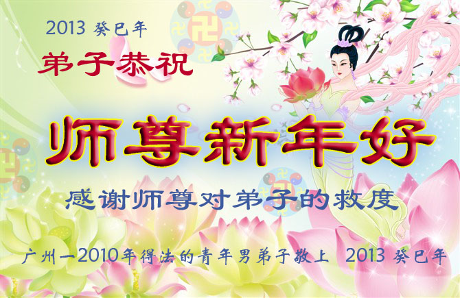 叩谢师尊对弟子的慈悲救度! 广东省广州市一个2010年得法的青年男弟子恭祝师尊过年好!